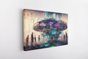 Obraz przedstawiający futurystyczne miasto ze stojącymi wokół niego ludźmi I gigantycznym obiektem pośrodku obrazu