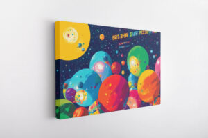 Obraz przedstawiający grupę ludzi stojących przed grupą planet na niebie w jasnożółtych I niebieskich kolorach