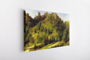 Obraz przedstawiający górę z drzewami I przechodzącą przez nią drogą oraz niebo z chmurami nad nią